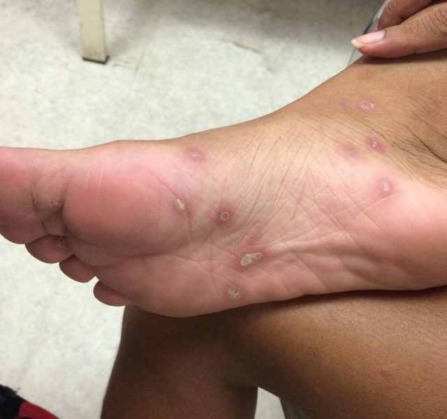 Secondary syphilis may result if primary infection is not treated. Sometimes patients can’t simply notice ulcer that may spread in different parts of the body. That is the main reason for development of secondary syphilis. It usually appears several weeks after patient was infected, sometimes more. Symptoms may vary depending on health conditions and organism of every person individually.